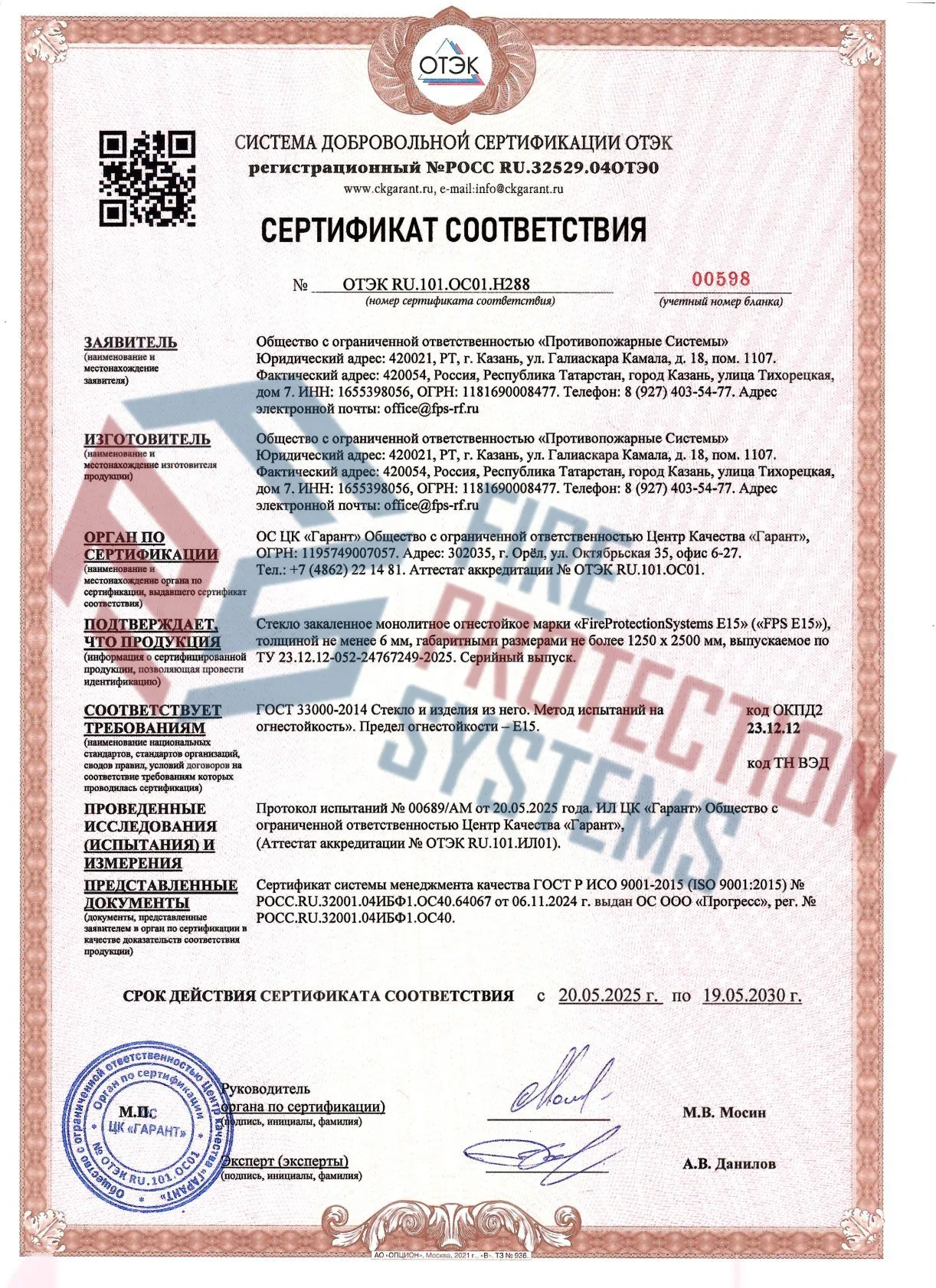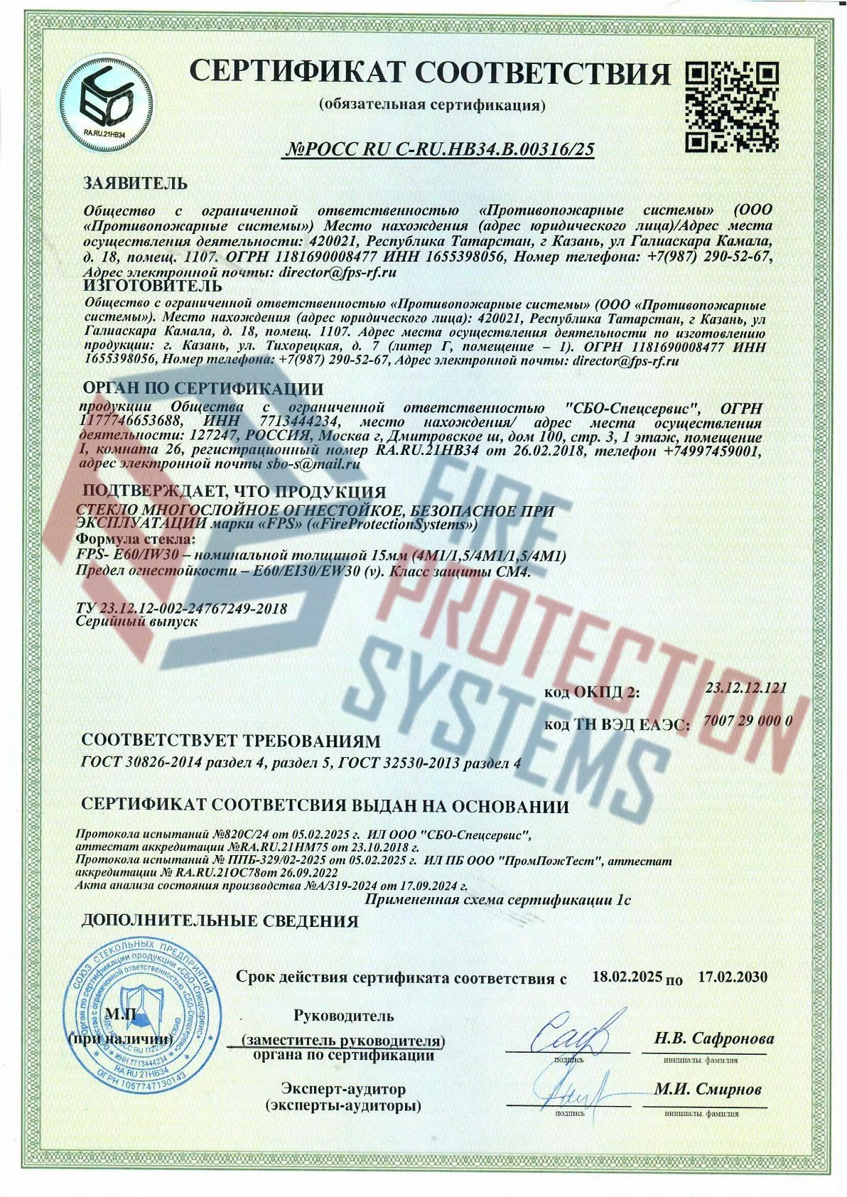 Остекление: Огнестойкое стекло толщиной 22-24 мм для эффективной защиты от распространения огня и дыма.
