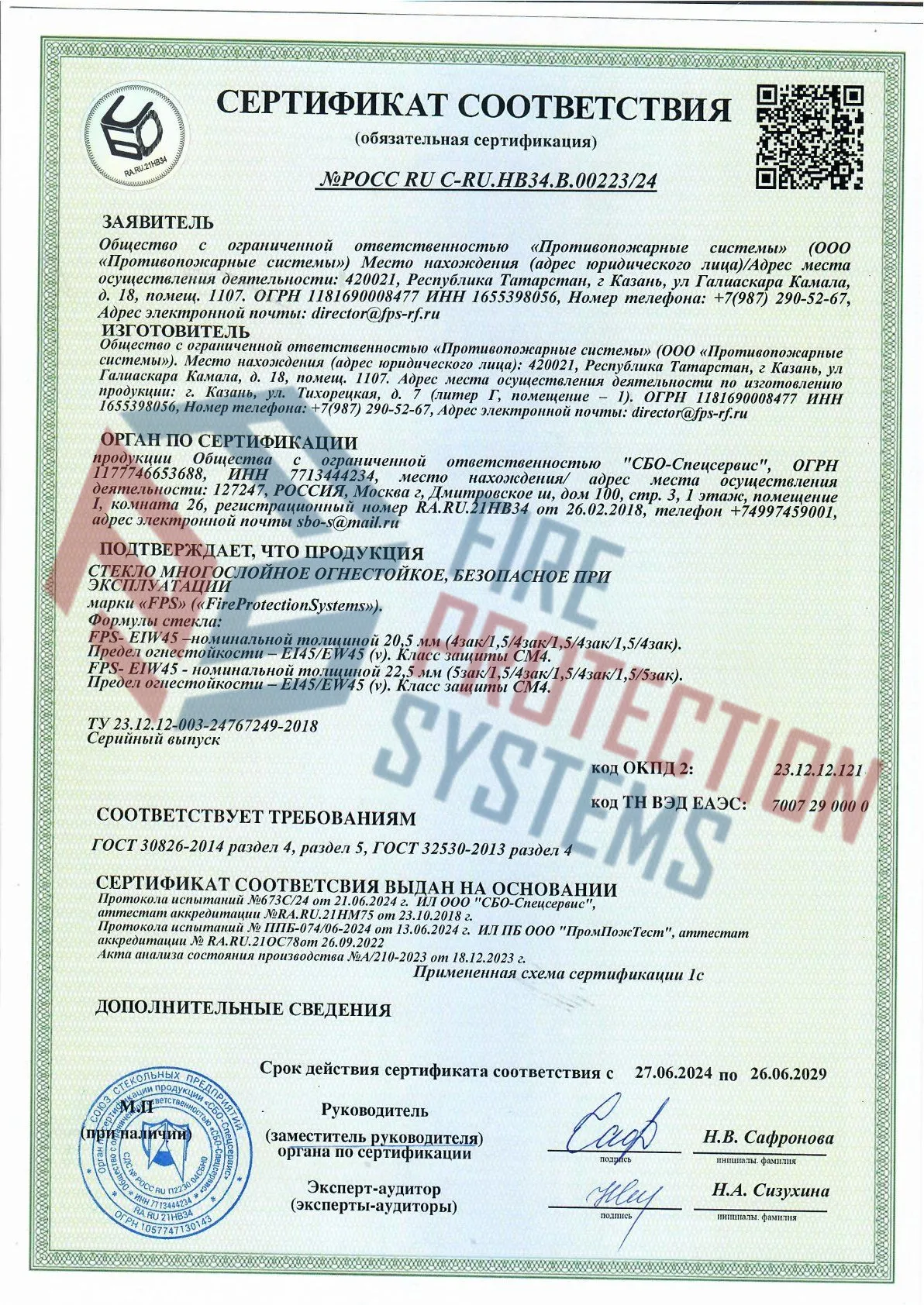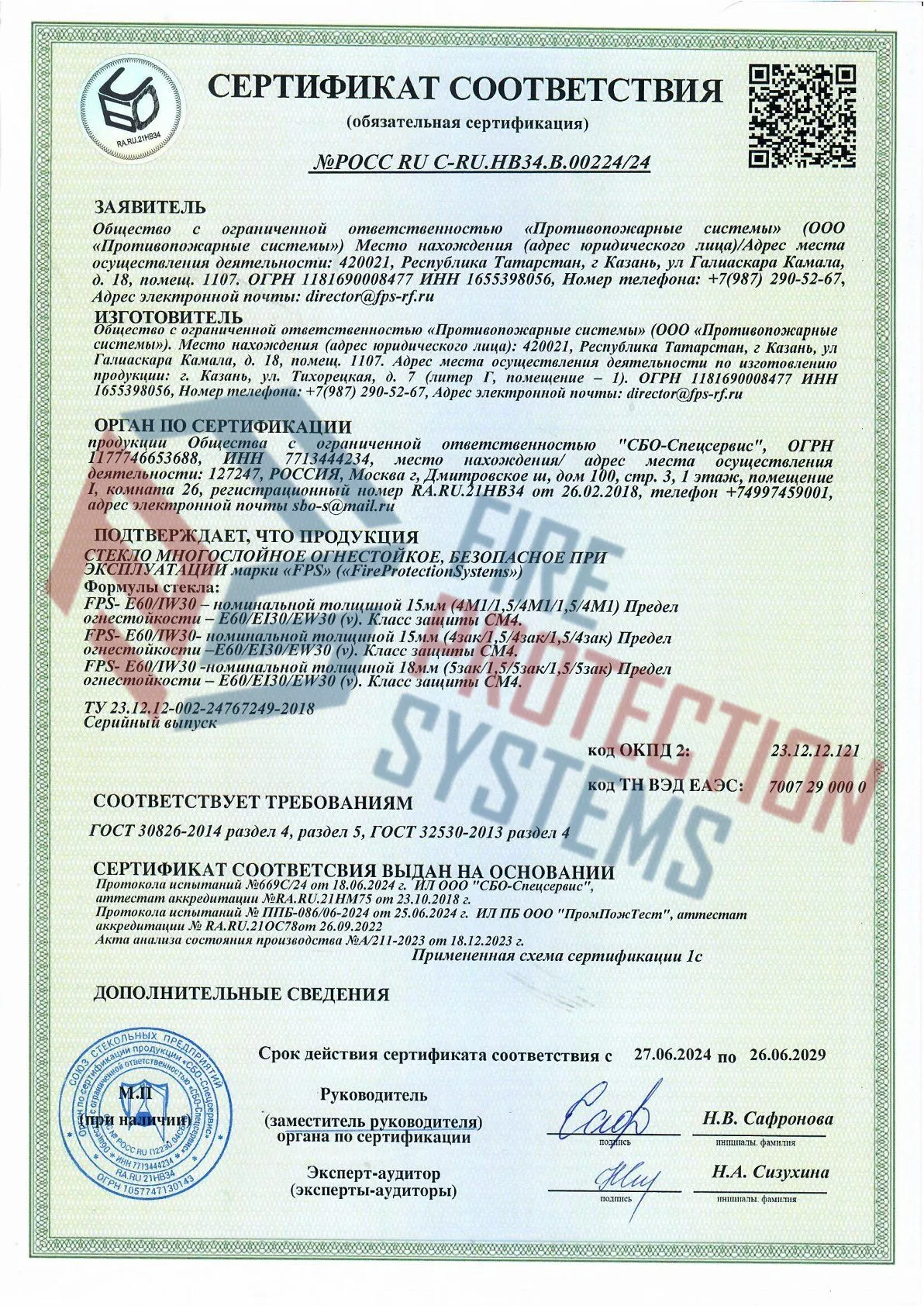 Толщина стекла: Составляет 10-12 мм, что соответствует требованиям для заявленного класса огнестойкости.